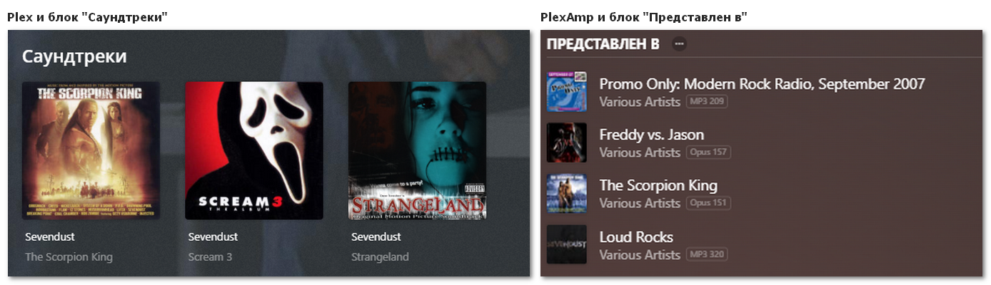 Various Artists), то его вы в этом блоке не увидите 🤯 - Но! Условный PlexAmp умеет динамически добавлять блок «Представлен в» (appears on). Как пишут разработчики, это фишка клиента, он делает это динамически и в момент открытия страницы исполнителя (т.е. в отличии от блока «Саундтреки» это не серверная фича). Ну и да, этого нет в клиенте Plex, только в плеере PlexAmp