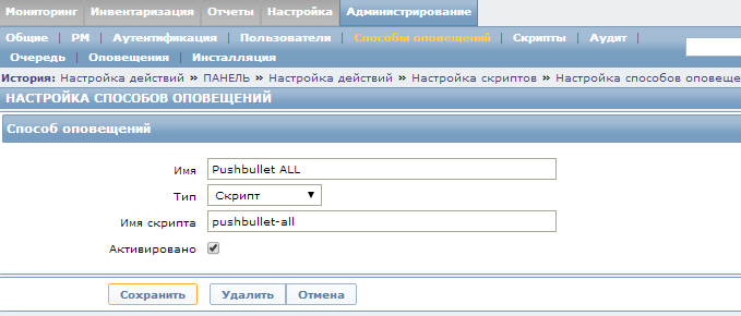 Создайте новый способ оповещения (Администрирование — Способы оповещений)