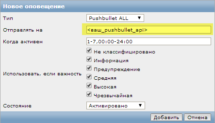 Где $N – переменные. $1 – уникальный API (позже указывается в профиле пользователей Zabbix), $2 – будет заголовком, $3 – станет телом сообщения. Подробнее в справке Zabbix.